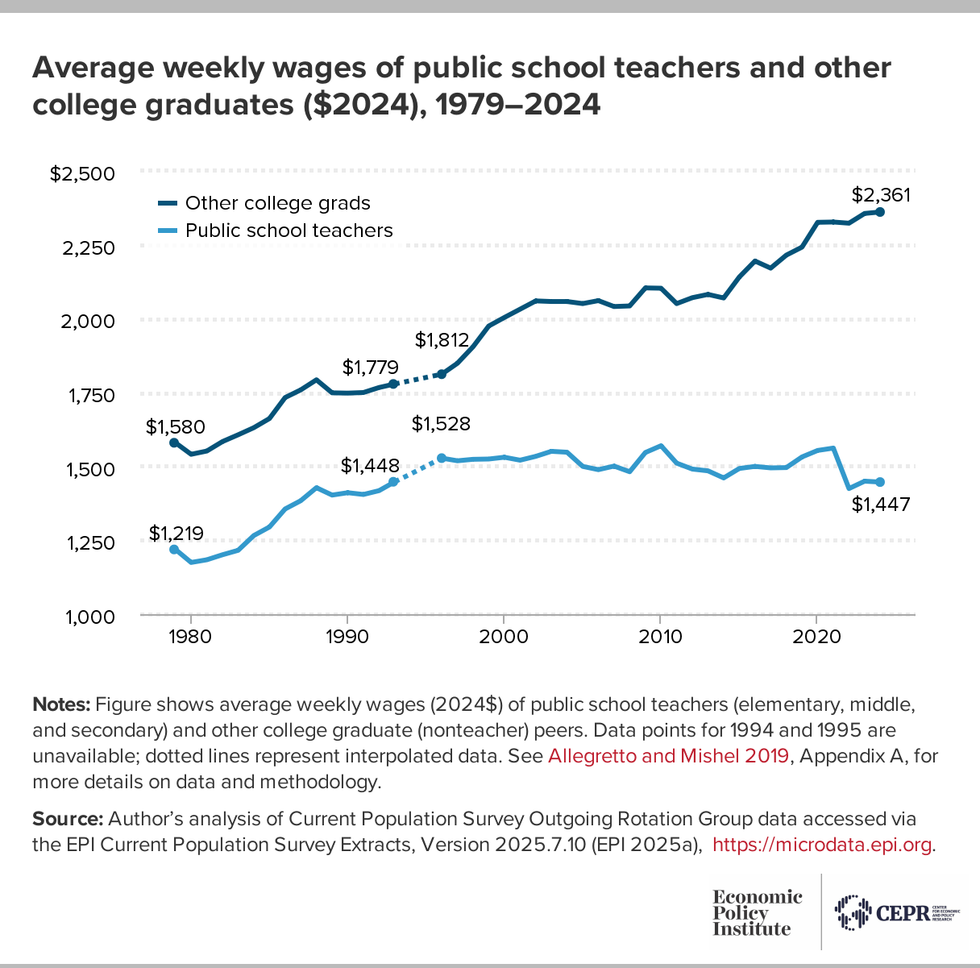Allegretto tracked data back even further—to 1979, when teachers earned an average of $1,219 a week, while other graduates earned $1,580, adjusted for inflation. In 2024, those figures rose to $1,447 for teachers and $2,361 for other similarly educated workers.