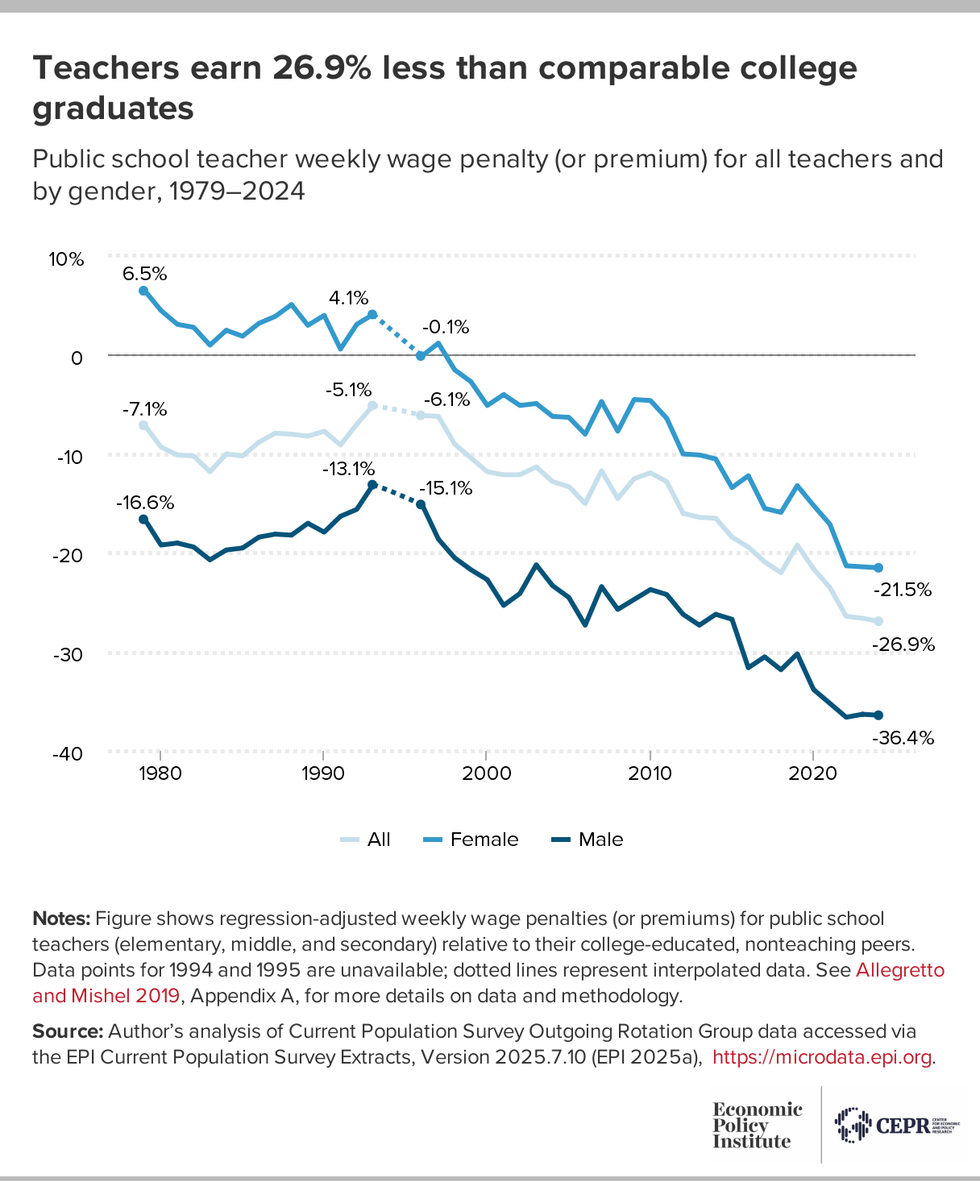 Sylvia Allegretto, a senior economist at the Center for Economic and Policy Research and research associate at the Economic Policy Institute, found that this gap, known as the teacher pay penalty, grew to 26.9% in 2024, "a significant increase from 6.1% in 1996."
