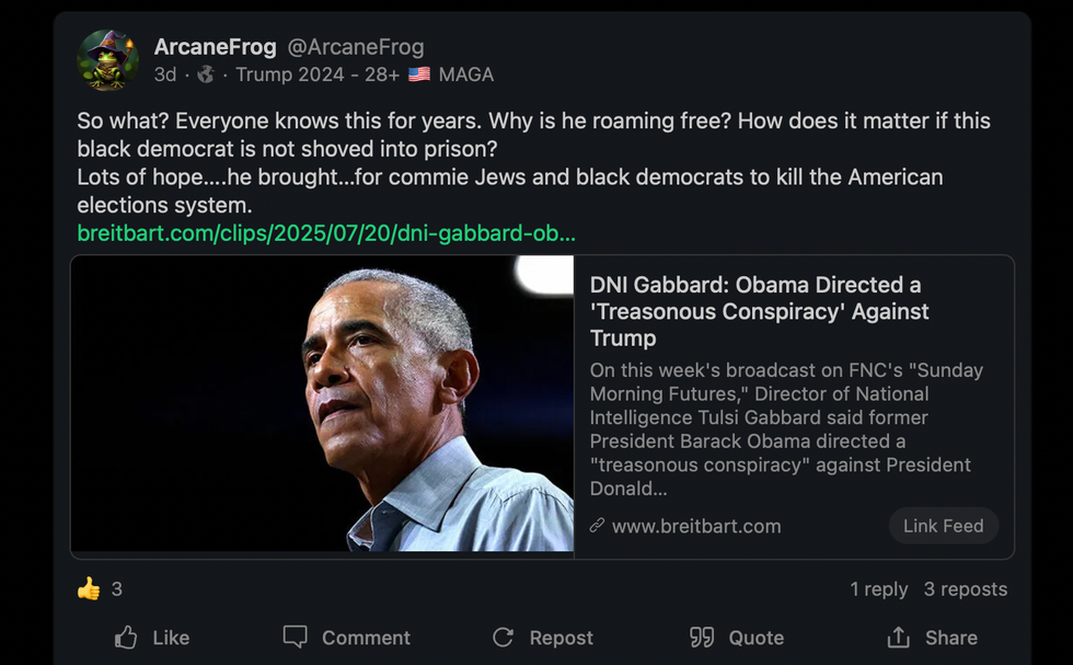 With violent rhetoric targeting Obama beginning to spread on fringe platforms, fanned by Trump’s and Gabbard’s posts, we risk further normalizing political violence which is already on the rise.