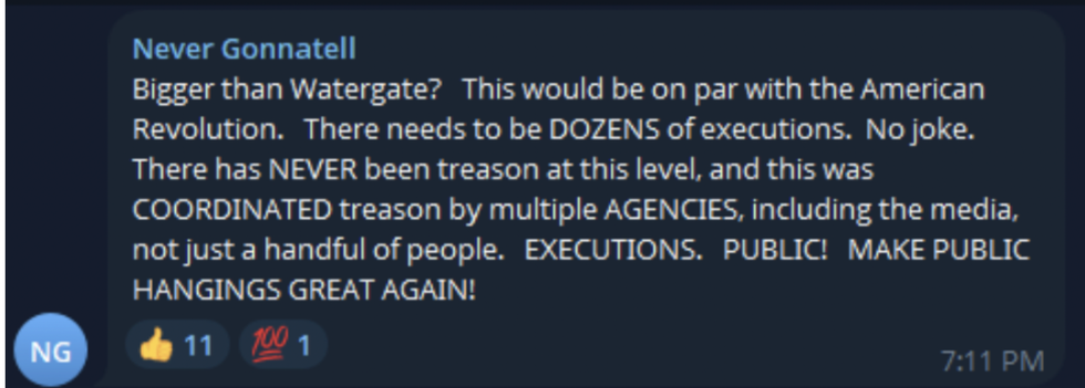 On Telegram, comments made between July 17 and July 20 targeting Obama as treasonous and deserving of either imprisonment or death rose from 0 to 12. A manual review by GPAHE of private Telegram groups not immediately accessible by scraping revealed numerous other similar posts. Telegram channels, including ones associating themselves with the conspiratorial QAnon movement, were excited about the prospect of Obama being convicted of treason, which would lead to him facing “the rest of his life in federal prison or the death penalty.” Other chat groups on Telegram, which associate themselves with far-right influencers such as Catturd and extremist groups like the white supremacist Proud Boys, had several users calling to hang Obama (“he should swing,” “let’s see him swing on national TV”), including calls to “hang them all” and “have a huge fireworks exhibition,” while others fantasized about “DOZENS of executions,” saying “MAKE PUBLIC HANGINGS GREAT AGAIN,” a reference to Trump’s motto, “Make America Great Again.”
