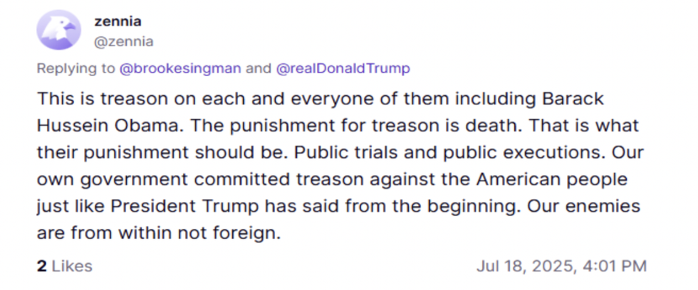 On Truth Social, comments made between July 17 and July 20 targeting Obama as treasonous and deserving of either imprisonment or execution rose from 3 to 36, an 1,100% increase, including a high of 56 comments on July 19, reflecting a frightening 1,767% increase. Gabbard’s post enraged Trump supporters who were quick to call for a military tribunal against Obama, demanding that Attorney General Pam Bondi “get them all now and don’t waste another day… The punishment for Treason is Hanging,” and that Obama and his former cabinet “should all [be] put up against a wall for a firing squad.” One user expressed glee at the possibility of Obama being “prosecuted for the death penalty,” saying “I’m so happy finally accountability for that corrupt piece of dog sh*t.” Another called for “public trials and public executions” against former members of the Obama administration, saying “our enemies are from within not foreign,” sharing a similar remark from Vice President JD Vance, who in a February address to European leaders warned them of “the threat from within.”