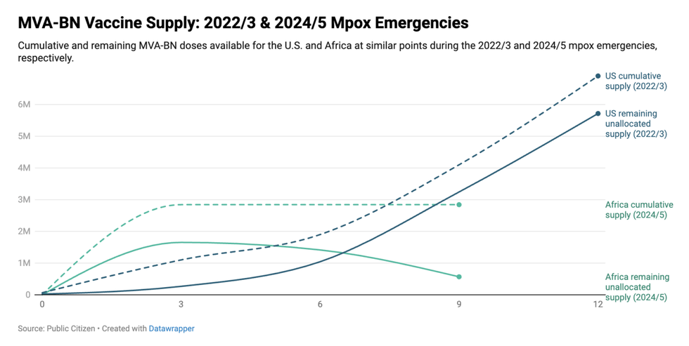 A June report by Public Citizen put the striking shortfall of doses into even greater perspective. The group reported that Africa had nearly six times fewer doses of the vaccine than the United States had during the 2022-23 outbreak, which was markedly less severe than what Africa currently faces.