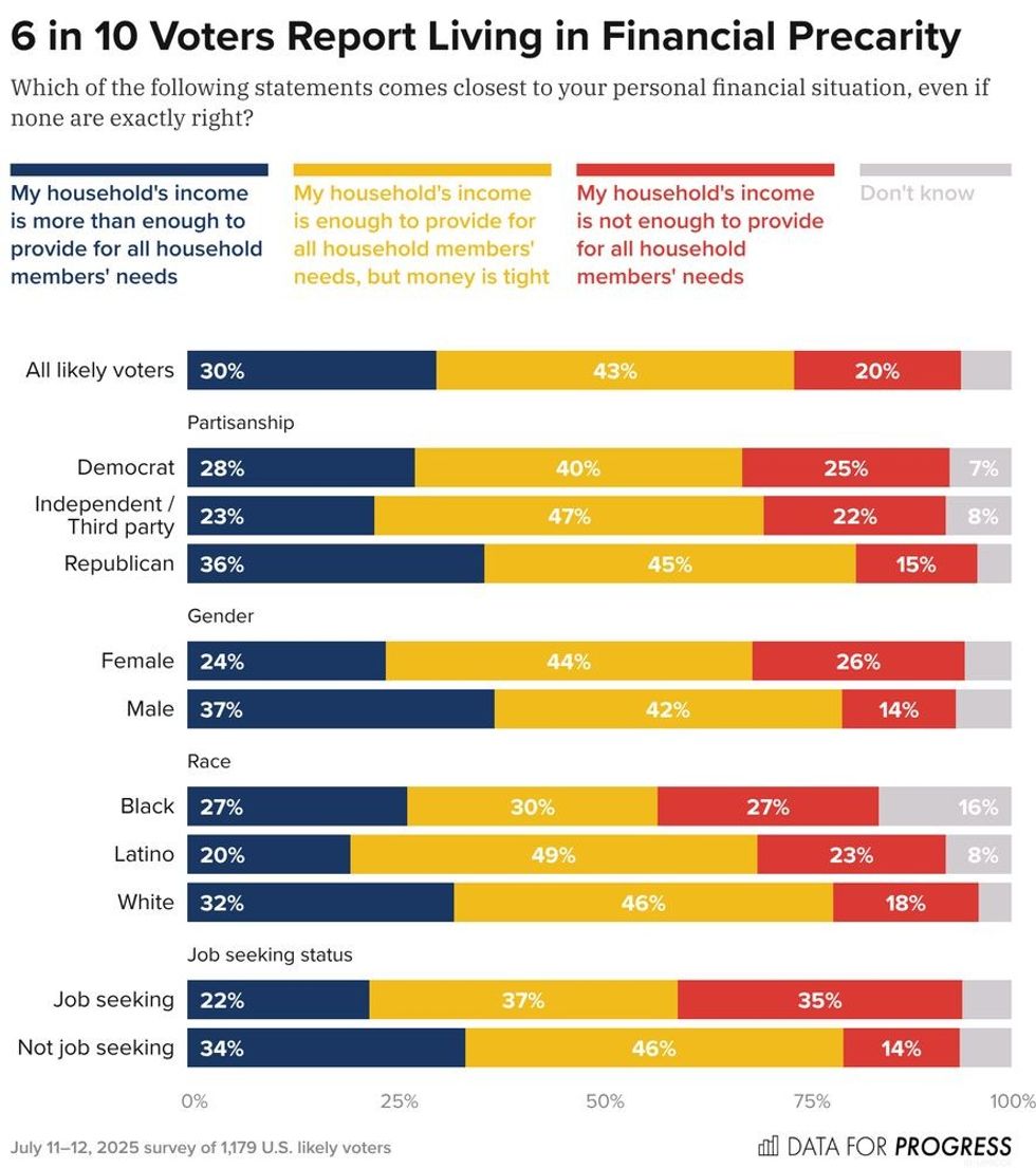 A poll released Friday by Data for Progress found that, "Only 30% of likely voters report having enough income to be able to comfortably provide for their household's needs, while a plurality of voters (43%) say they have enough income but money is tight, and 20% say they do not make enough to provide for all household members' needs."
