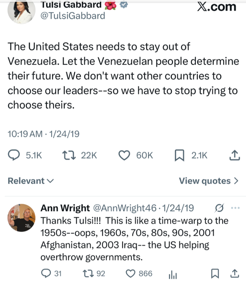 Seven years ago, US Congresswoman Tulsi Gabbard wrote in 2019 on Twitter: "The United States needs to stay out of Venezuela. Let the Venezuelan people determine their future. We don't other countries to choose our leaders—so we have to stop trying to choose theirs."