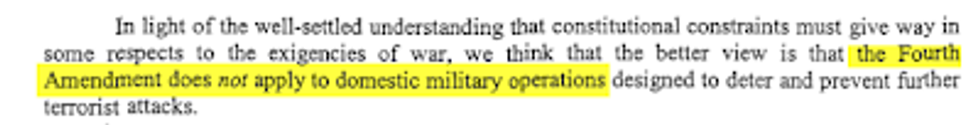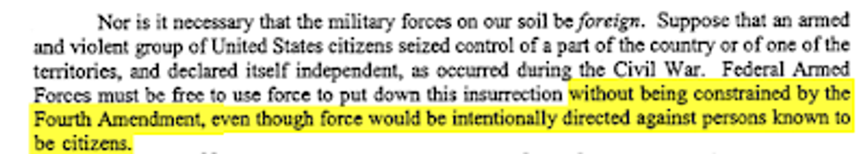 as the Posse Comitatus Act) or even by the Constitution's Fourth Amendment, which -- the Memo concluded -- was "inapplicable" to what it called "domestic military operations."