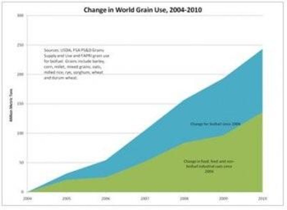 Since 2004, biofuels mandates in the U.S., Europe and elsewhere have doubled global demand for grains. As the graph below shows, it doesn't take a trained economist to imagine the impact this market pressure can have on farmers and poor people around the world.