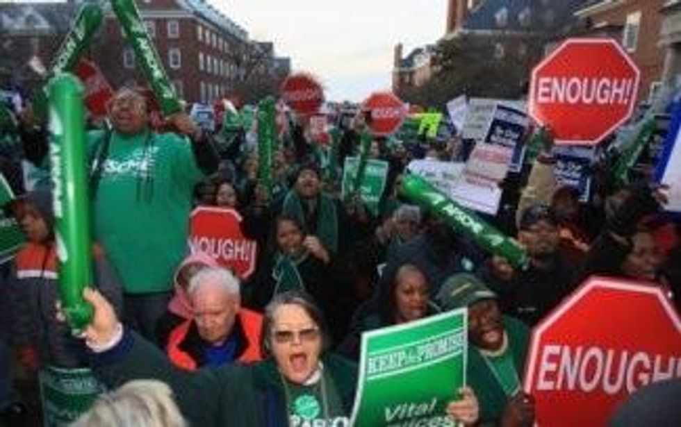 Therefore, it's up to us. All of us who are concerned, disgusted, outraged, and revolted must step up. Grassroots campaigns have sprung up across the country, from "Stand Up Ohio" to "Not My Wisconsin." You can join these campaigns at the local level or get involved with national campaigns like "We Are One," which is sponsoring a national day of action on April 4.