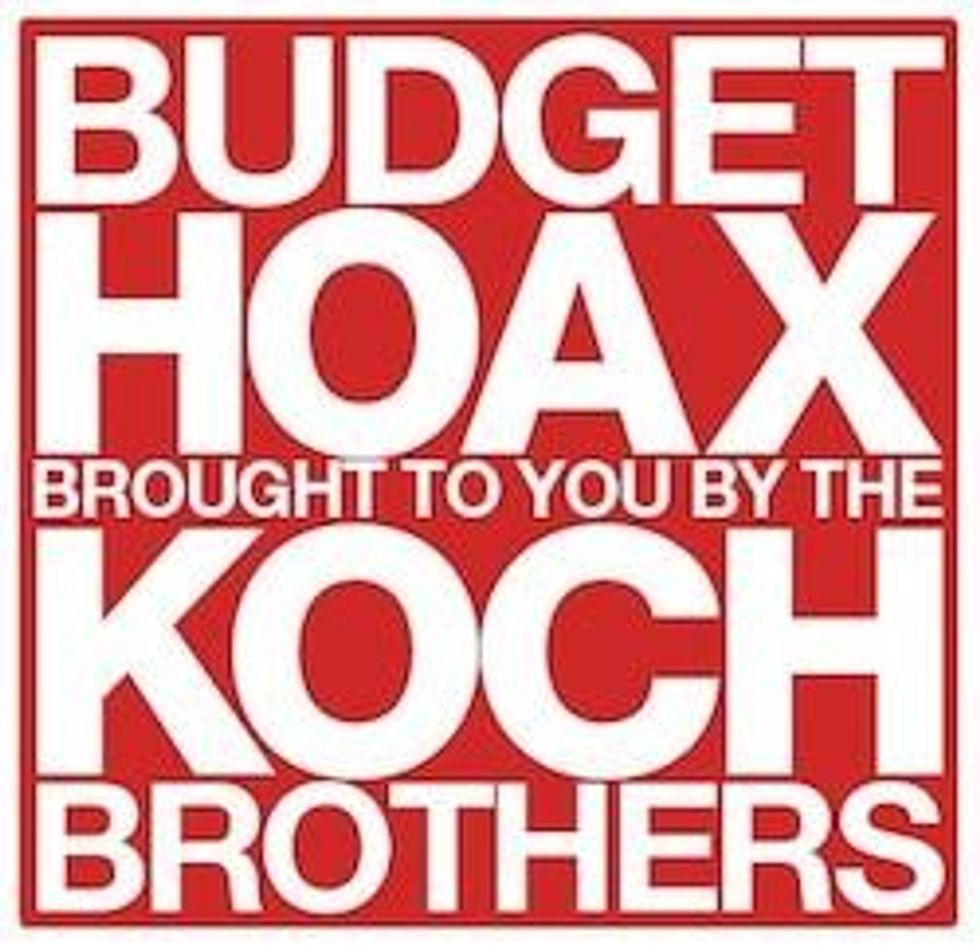 Sitting in the audience were dozens of protestors wearing pins: "Budget Hoax, Brought to You by Koch." And one or two snuck in signs that said "Governor Walker Get off the Koch," demonstrating that how ever far he traveled Walker's critics were not going away.
