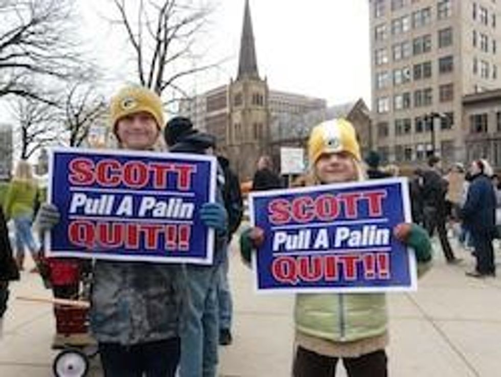 In this clever piece of spin, Palin picks up on Walker's job saving theme. Walker threatened 1,500 layoffs in advance of the vote on the union busting bill, then stopped the pink slips from rolling the day after the bill passed. But the threats were all theater. Walker was recently forced to admit at a hearing in Congress that the union-busting provisions had no fiscal impact. "We are doing this to save jobs," is a great talking point until the day the bill is implemented and thousands upon thousands of municipal workers are given the ax.