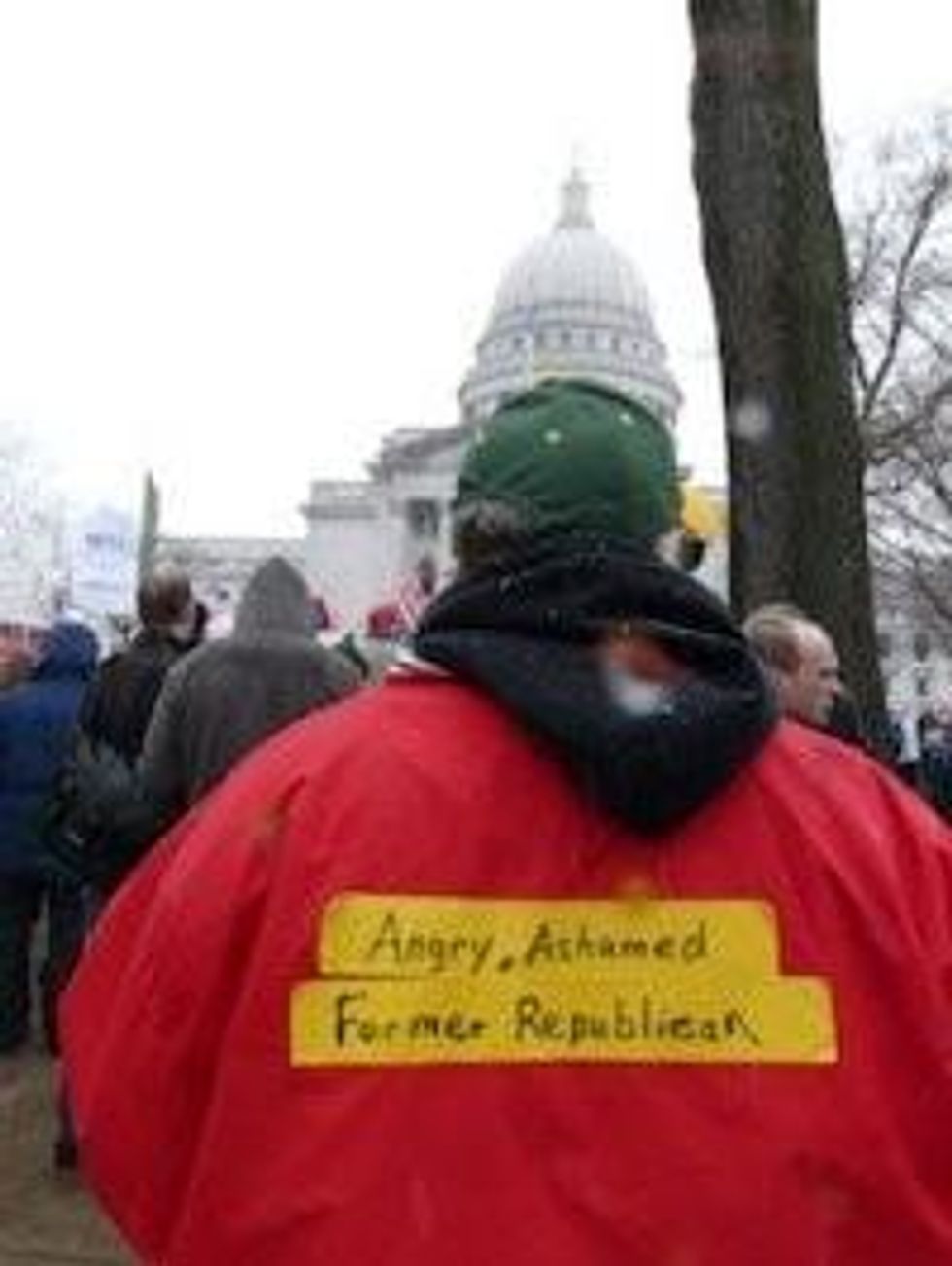 At the back of the crowd was a man standing uncomfortably, hands in pockets. On the back of his windbreaker was a taped message which read: "Angry, Ashamed, Former Republican." He told me he had voted Republican for 30 years, had voted for Palin and Walker, but now was disgusted with what he was seeing. "Fundamentally, it is wrong to take away people's right to negotiate in good faith. This is overreach by the Republican Party. Abraham Lincoln would not be a Republican today."