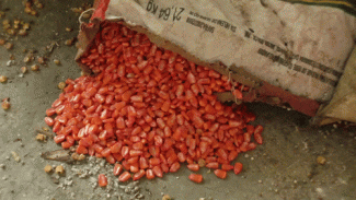Inside the room, sacks of sorghum and maize seeds, bags of fertilizer and boxes of seeds are all jumbled into a huge pile. Some of the sacks are labeled, others are not. Several open bags from Monsanto/DeKalb in Brazil spill bright pink, chemically coated maize seeds onto the floor. Other maize seeds are in unlabeled white sacks which are punctured with holes... made by rats? Children? The farmers? That seed is covered with a white powder.