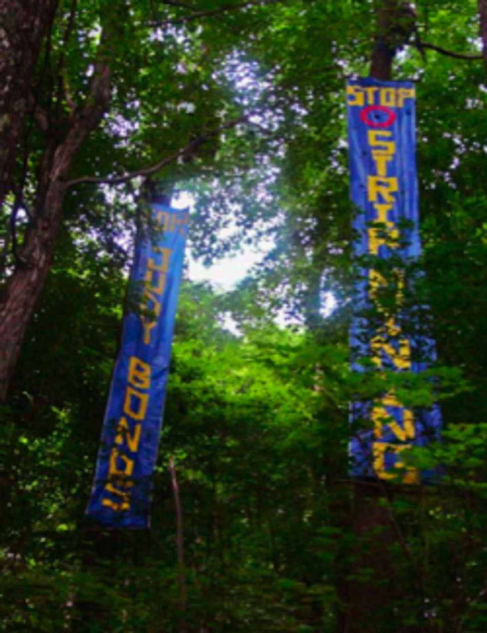 The tree-sitters have dropped two banners from their platforms: STOP STRIP MINING and FOR JUDY BONDS.