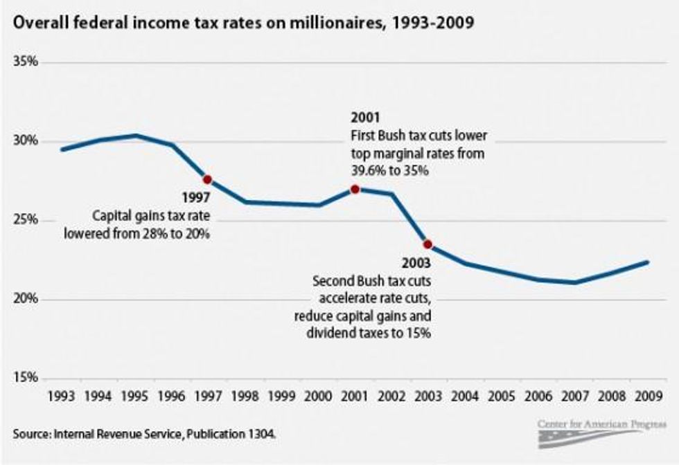 Millionaires paid an average tax rate of 22.4 percent in 2009, down by a quarter since 1995, when they paid an average of 30.4 percent. (see chart)