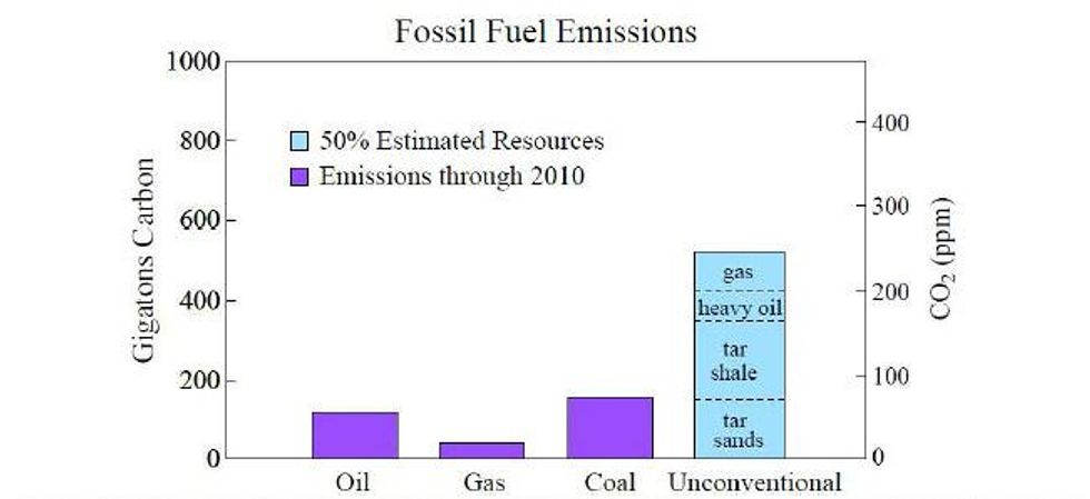 Now, I'll illustrate the emissions scenario from potential burning of tar sands oil and other unconventional fossil fuels (UFF) as contrasted with conventional fossil fuels (oil, gas, and coal). Figure 1 helps make clear why the tar sands and other unconventional fossil fuels ought not to be developed and burned. The purple bars show the total emissions to date from the conventional fossil fuels. These past emissions, plus a smaller contribution from net deforestation, are the cause of the CO2 increase from 280 to 391 ppm -- where we are today. I wrote before, "Easily available reserves of conventional oil and gas are enough to take atmospheric CO2 well above 400 ppm, which is unsafe for life on earth."