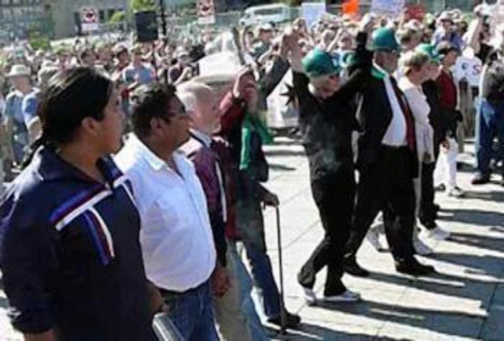 Holding hands with Maude Barlow and marching with Dave Coles, Tony Clarke, Graham Saul, George Poitras and a group of Aboriginal leaders, we marched slowly towards a metal fence. Media blocked our way and it was difficult to see past them to the police awaiting us, but it seemed to me that they were standing back rather than moving forward to confront us. That was comforting and a small sign that this would more or less go as planned. We were supposed to spread out at arms length to give each of us room to step up onto the lower bar of the fence and swing the other leg over. But the media funnelled us into a narrow space and that just wasn't going to happen. Coles was first over, the rest of us one or two at a time after. An RCMP approached and told me that I was in a restricted zone and if I did not go back over the fence he would arrest me. He asked again to make sure I understood. Plastic cuffs bound my hands behind me and that was it -- my first arrest in a lifetime of political and labour activism.