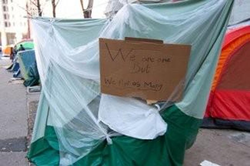 In Philadelphia, a new Resurrection City has arisen, however, and across the street from this rapidly expanding community, there's Philly's swankiest address, the 48-story Residences at The Ritz-Carlton, where a one-bedroom bachelor's pad can be had for half a million bucks, and the penthouse, $12 million. Backlit by warm, yellow lights, Ritz-Carlton residents can be seen each night looking down at the mess of tents below. Some peer through binoculars, others snap photos, but they didn't pay through their cosmetically enhanced noses to put up with this stinking Third-World vista. It is quaint and lively, yes, but also squalid and somewhat menacing. Tonguing a prosciutto roll, they frown and imagine the day, soon, too soon, when these tents will surround them completely.