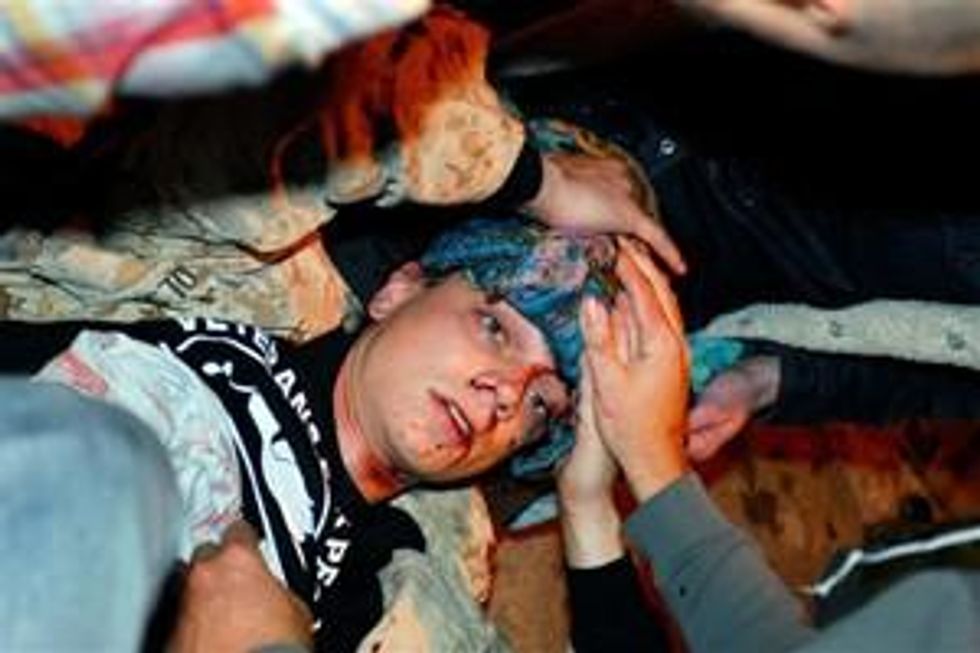 Video from the Occupy Oakland march on Tuesday, Oct. 25, looks and sounds like a war zone. The sound of gunfire is nearly constant in the video. Tear-gas projectiles were being fired into the crowd when the cry of "Medic!" rang out. Civilians raced toward a fallen protester lying on his back on the pavement, mere steps from a throng of black-clad police in full riot gear, pointing guns as the civilians attempted to administer first aid.
