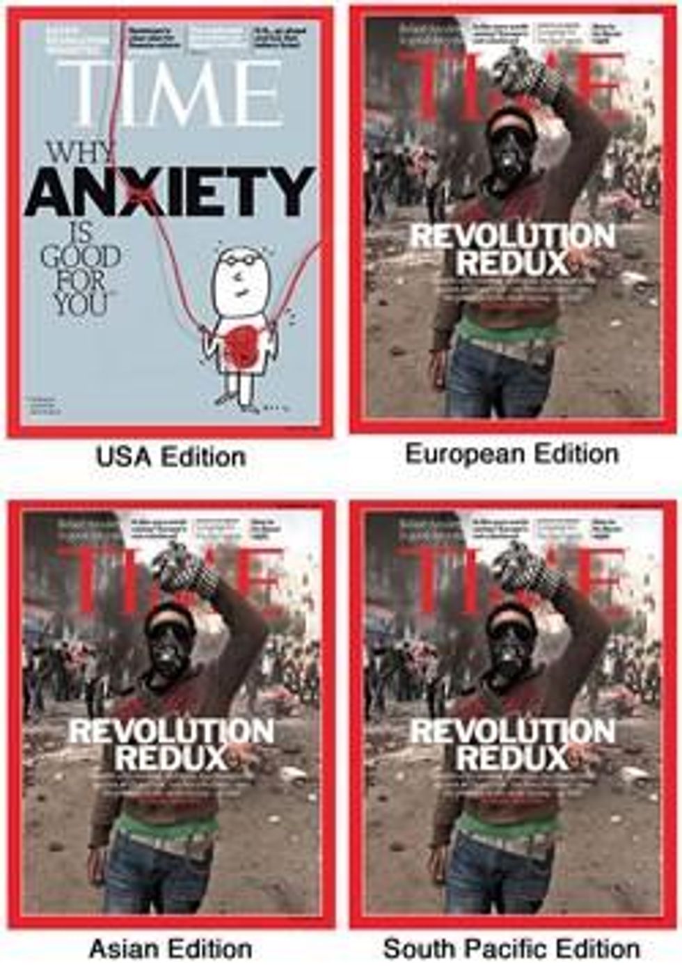 In three editions - Europe, Asia and South Pacific - Time magazine's visually hot, tumultuous cover featured a gasmask-protected Egyptian protester, upraised fist overhead with a chaotic street background behind. The headline: "Revolution Redux". Not so in the exceptional American edition. There, the visually cool, wanna-be New Yorker-ish cover was a text-dominated cartoon against a light gray background: "Why Anxiety is Good For You."