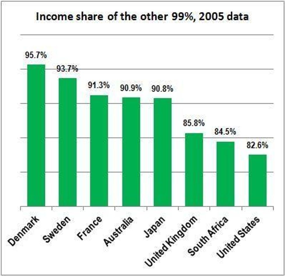 The only developed country that comes close to the United States in the decimation of its other 99 percent is the United Kingdom. In the UK, the other 99 percent take in 85.8 percent of total income, down from 90.2 percent in 1990, the earliest year with data are available. Surely it's no coincidence that some of the biggest Occupy encampments have been in New York and London.