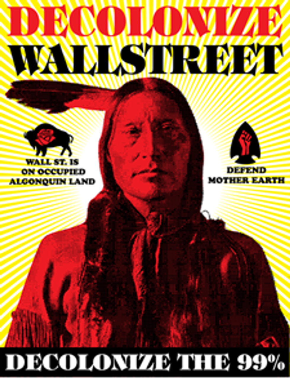 To occupy means to hold space, and I think a group of anti-capitalists holding space on Wall Street is powerful, but I do wish the NYC movement would change its name to "'decolonise Wall Street"' to take into account history, indigenous critiques, people of colour and imperialism... Occupying space is not inherently bad, it's all about who and how and why. When white colonizers occupy land, they don't just sleep there over night, they steal and destroy. When indigenous people occupied Alcatraz Island it was (an act of) protest.