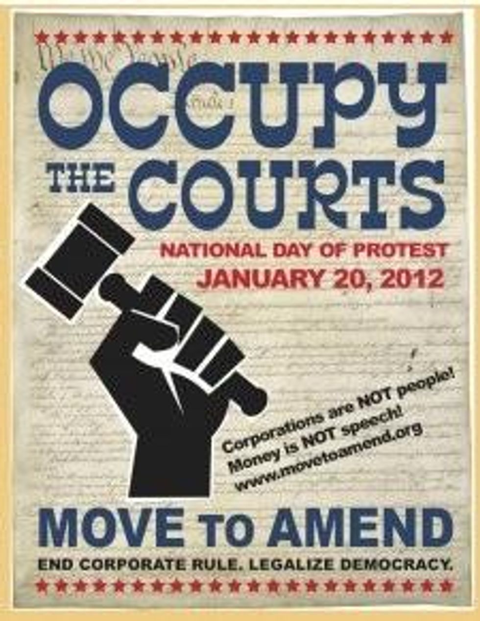 Inspired by the arrest of Princeton professor Cornel West on the steps of the Supreme Court and marking the second anniversary of Citizens United v. Federal Election Commission, Move to Amend declared January 20 as a national day of protest known as Occupy The Courts, targeting the courts as a possibility to bring cases against corporate power and government abuse. According to the Move to Amend website, there are hundreds of demonstrations scheduled across the country taking place at Federal buildings, Capitol buildings and local courthouses, calling for an end to corporate personhood.