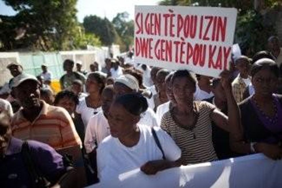On the morning of January 12, 2012, a group of women, children and men wound their way through the city wearing white, the Haitian color for mourning. Part memorial, they deposited wreaths of flowers on sites that had become mass graves during the 2010 earthquake, and part protest, they carried a banner that read "Two years later: Enough is enough." They alternated between singing a funeral dirge and chanting, "We need houses to live in!"