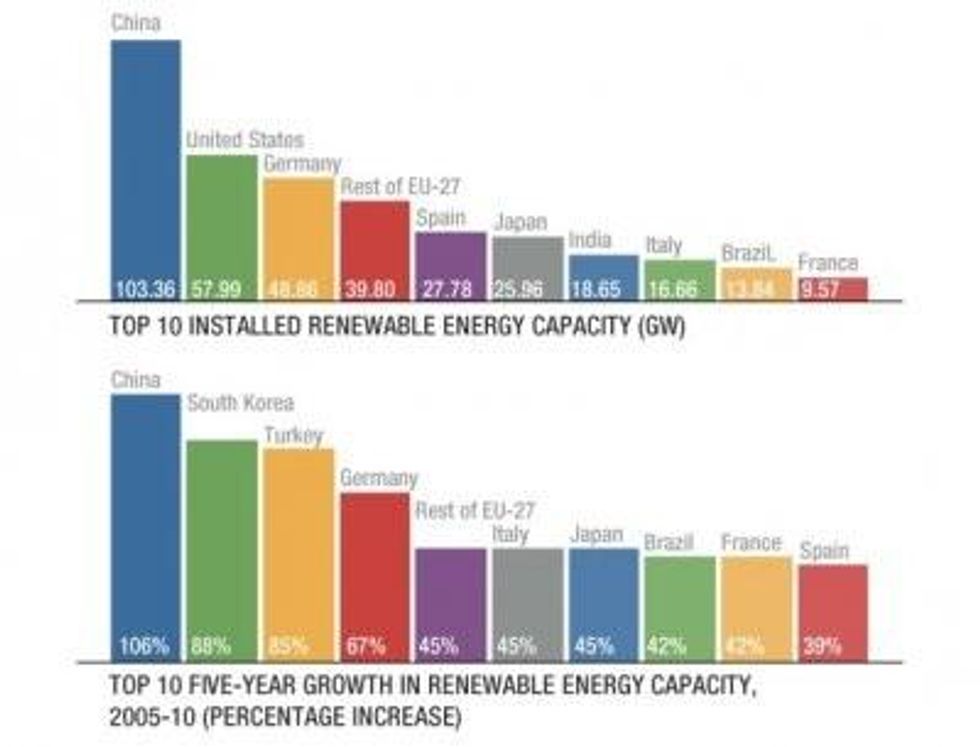 But Jacobson is aware of the resistance among policymakers. Past energy decisions in Japan have been biased in favor of nuclear power and centralized energy systems. Prior to the disaster, Japan was falling behind other industrialized countries in the development of renewable energy. A March 2011 report by the Pew Environment Group titled Who's Winning the Clean Energy Race? shows that China is surging ahead--attracting a record U.S.$54.4 billion in clean energy investments in 2010.8 While Japan is the third-largest economy in the world, it is ranked fifth in terms of its installed renewable energy capacity. In the past five years, according to the Pew report, renewable energy has grown by 45 percent in Japan, compared with 108 percent in China.