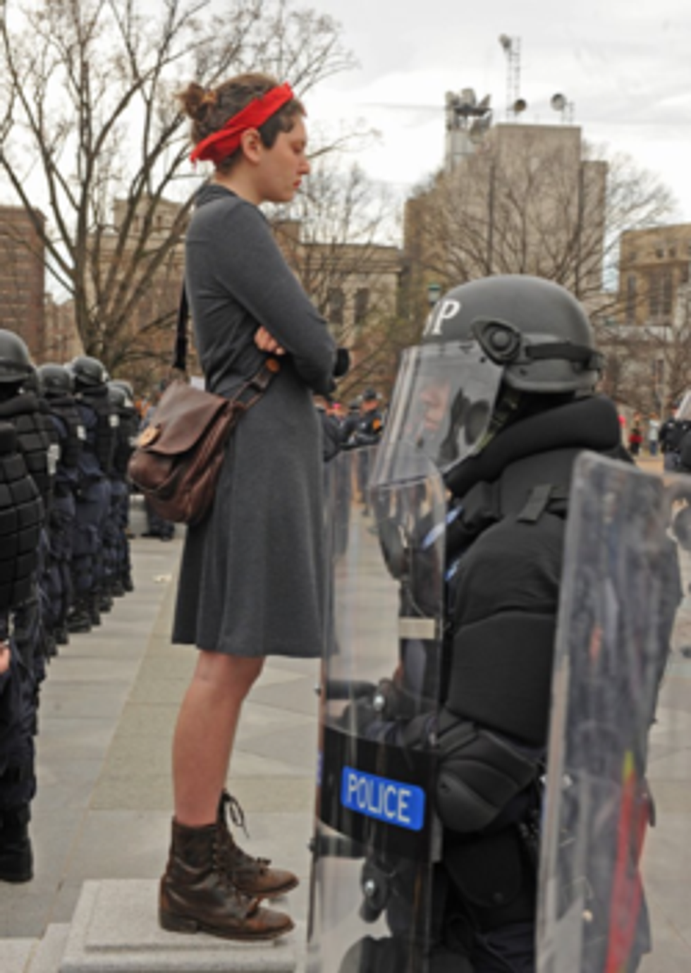 About 1,000 people took part in the March 3 protest. While organizers had a permit to gather on the Capitol grounds, some protesters sat on the steps of the Capitol Building, locked arms and refused to move. They were arrested and dragged away by the Virginia State Police Tactical Team, which arrived in riot gear and accompanied by police dogs.