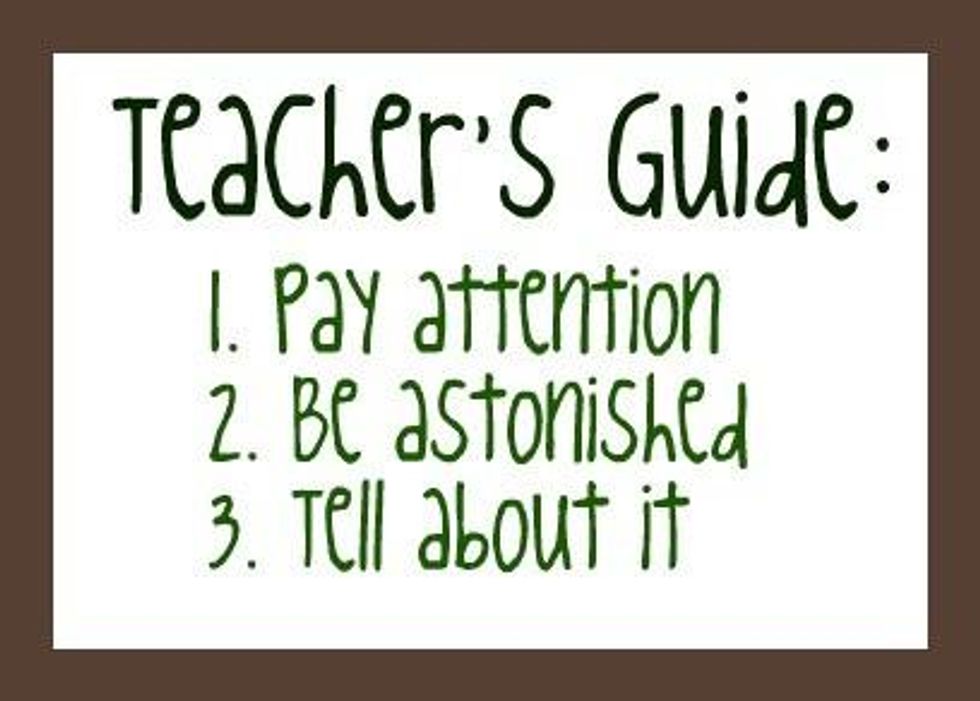 After years of research, I have developed a three-stage teaching method that breaks new ground in pedagogical theory: Stage 1: Pay attention. Stage 2: Be astonished. Stage 3: Tell about it.