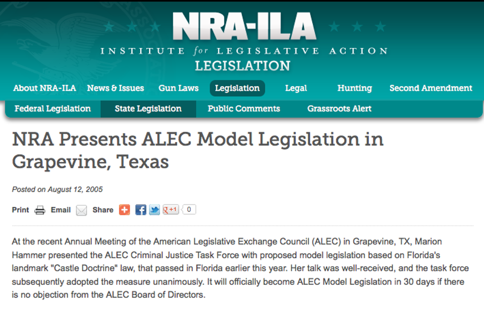 As Media Matters reported earlier, Florida's "stand your ground" law is nearly identical to the ALEC Castle Doctrine Act.