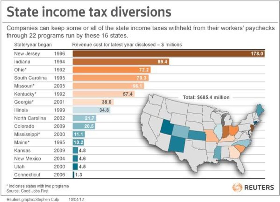 Across the United States more than 2,700 companies are collecting state income taxes from hundreds of thousands of workers - and are keeping the money with the states' approval, says an eye-opening report published on Thursday.