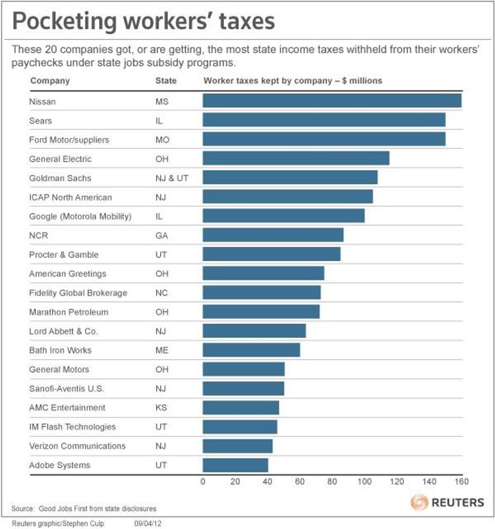 General Electric, Goldman Sachs, Procter & Gamble, Chrysler, Ford, General Motors and AMC Theatres enjoy deals to keep state taxes deducted from their workers' paychecks, the report shows. Foreign companies also enjoy such arrangements, including Electrolux, Nissan, Toyota and a host of Canadian, Japanese and European banks, Good Jobs First says.