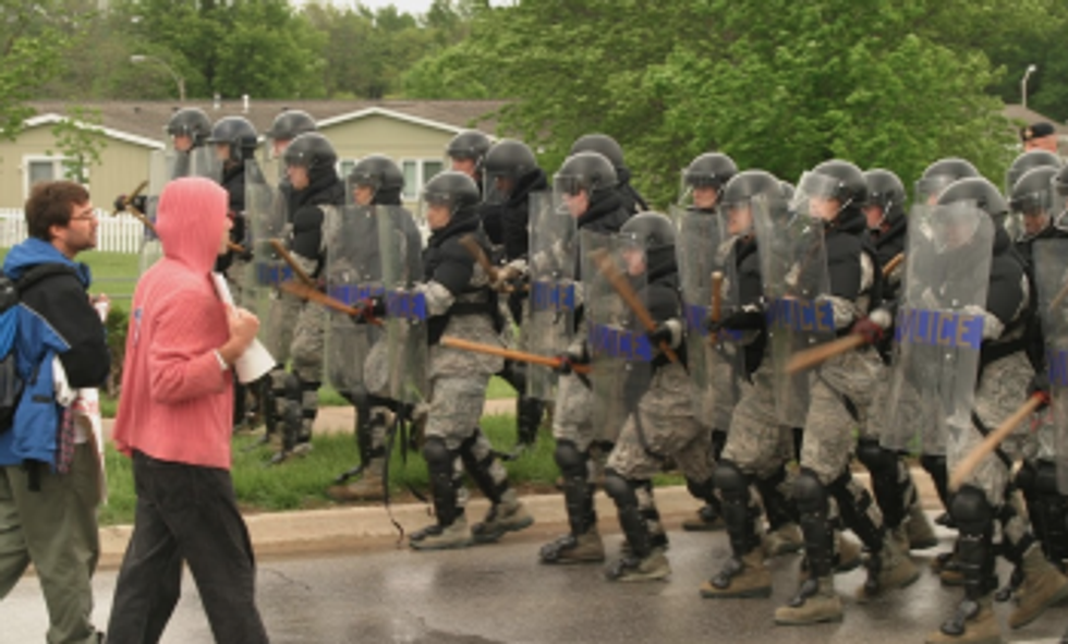 We'd prepared a litany of sorts announcing our intention to release ourselves from domination by war and the U.S. war machine, and reading the names of children killed by our country's war in Afghanistan. The Air Force security, decked out in camouflage-pattern riot gear with shields, helmets, batons, and of course guns, chanted one-two-three-four as they marched deliberately forward, intending of course, to seem as menacing as possible. From a distance they did, but when they were close enough that we could see their faces, through the riot shields... young, dutiful, far from fearsome... what to say?
