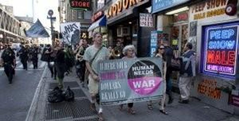 The coming together of ardent pacifists, anarchist drummers, and union organizers seemed fairly seamless and friendly on the streets of New York this week (and it was completely outnumbered by the police presence). But it was not without conflict: One woman handed out a flyer calling for fairness in our tax policies. Another woman countered: "but no taxes for war."