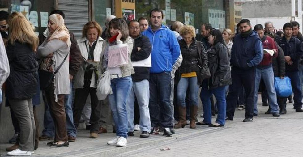 Spain's unemployment rate is nearly 25 per cent. And it's not just the peak level that leaves onlookers horrified, it's the speed of job loss. Fully 367,000 people lost their jobs in the first three months of the year alone. Half of young people under 25 are unemployed and in more than 1.7 million households no one at all has a job, the Financial Times of London reports.