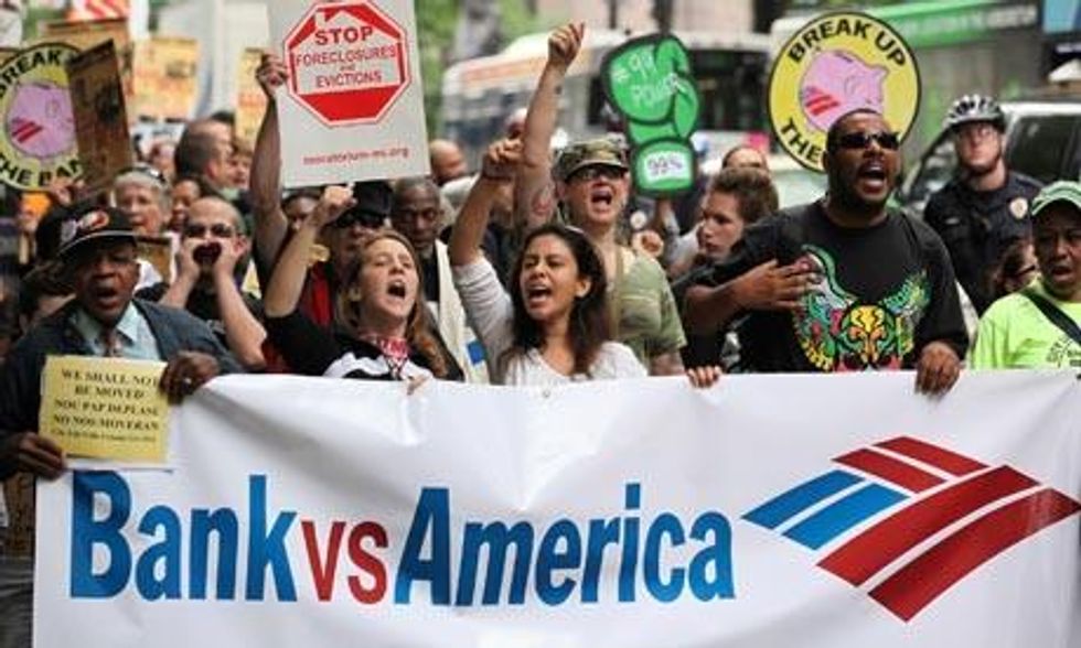Many activists expressed outrage at the bank's role in the subprime mortgage industry and the foreclosure crisis it helped spawn. As part of a federal settlement over widespread mortgage fraud, Bank of America agreed to hand over $11.8bn. Just two days before the protest, the bank announced it was contacting the first 5,000 of 200,000 mortgage customers who are eligible for a loan modification, with a potential decrease in their mortgage principal of up to 30%.