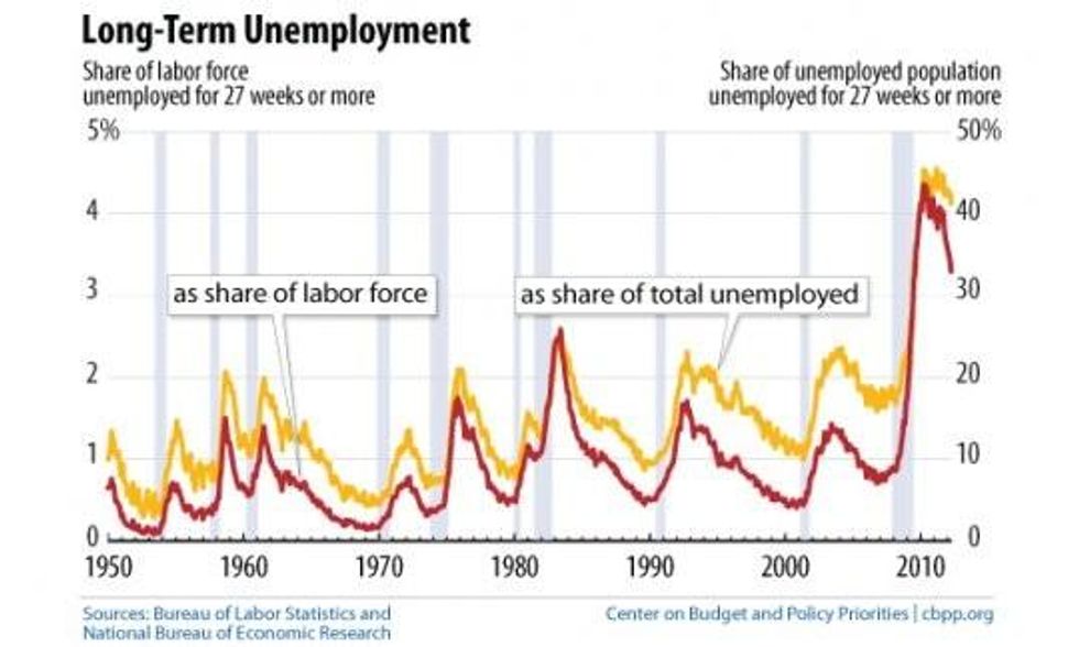 There are 12.5 million unemployed people still seeking work in the United States, and over 5 million of them have been looking for work for twenty-seven weeks or longer.