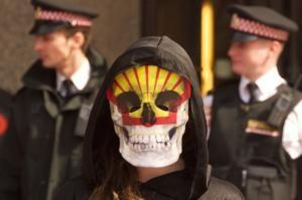 According to a report from the UK Tar Sand Network, five protestors wearing masks that combined Shell's logo with a skull stood silently throughout the meeting reminding the shareholders of the grave human rights and environmental injustices Shell has brought to communities in Nigeria, Rossport (Ireland), the Arctic and Canada.