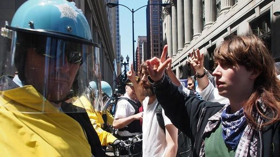 That was one of the chants on last Monday as protesters converged on the military behemoth's downtown Chicago offices. The corporate-types had read the press releases and allowed their workers to telecommute on Monday, locking their doors and presenting the 200 or 300 chanters, sign holders, die-iners, silly string squirters and paper airplane folders with a mostly empty building.