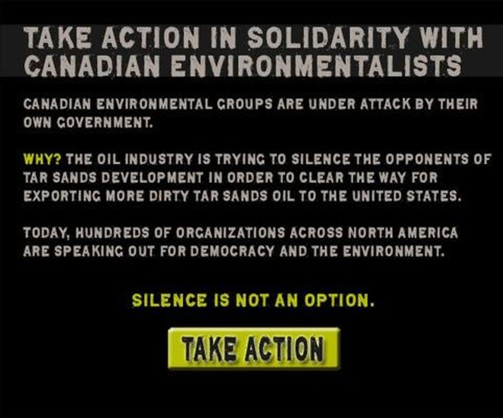 It's bad enough to see the Harper regime pushing dirty tar sands as the energy solution; now it is out to stifle an honest debate about how bad tar sands will be for our air, water, land, wildlife, our health and our climate. That's why we join our Canadian friends in protesting this attempt to silence debate about our energy future and the need to fight climate change.