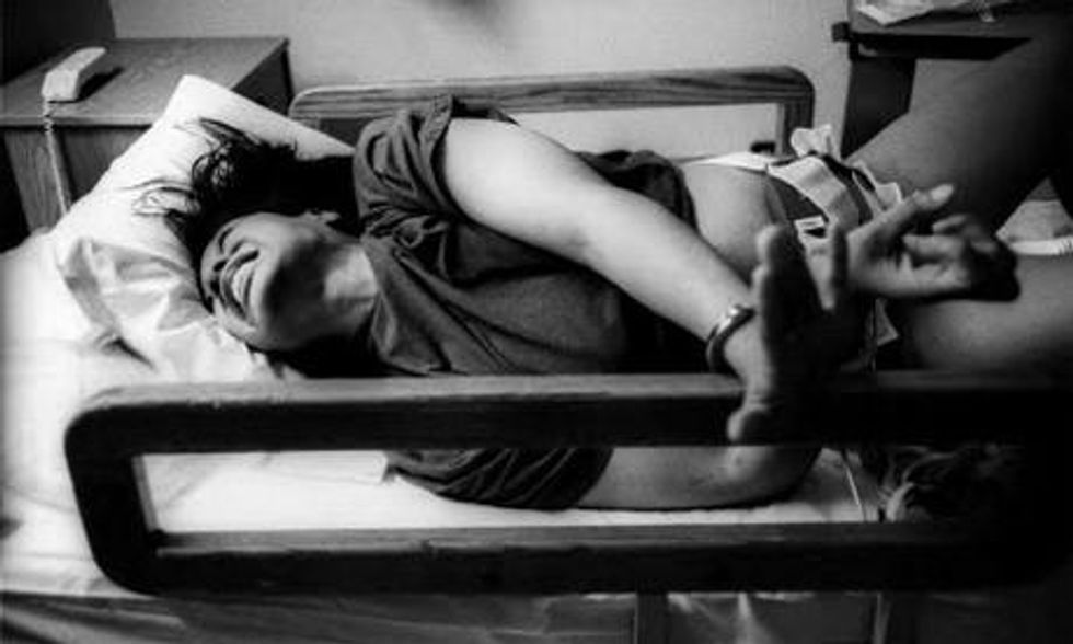 During a pre-natal check-up at the facility, her baby appeared to have no heartbeat, so she was sent to the county hospital. As the medical team tried to induce her, Fletcher claims that both her hands and both her feet were shackled to either side of the bed. Only when she finally went into labor, three days later, was one hand and one foot released. It's hard to imagine a more crucifying way to force a woman to try to give birth.
