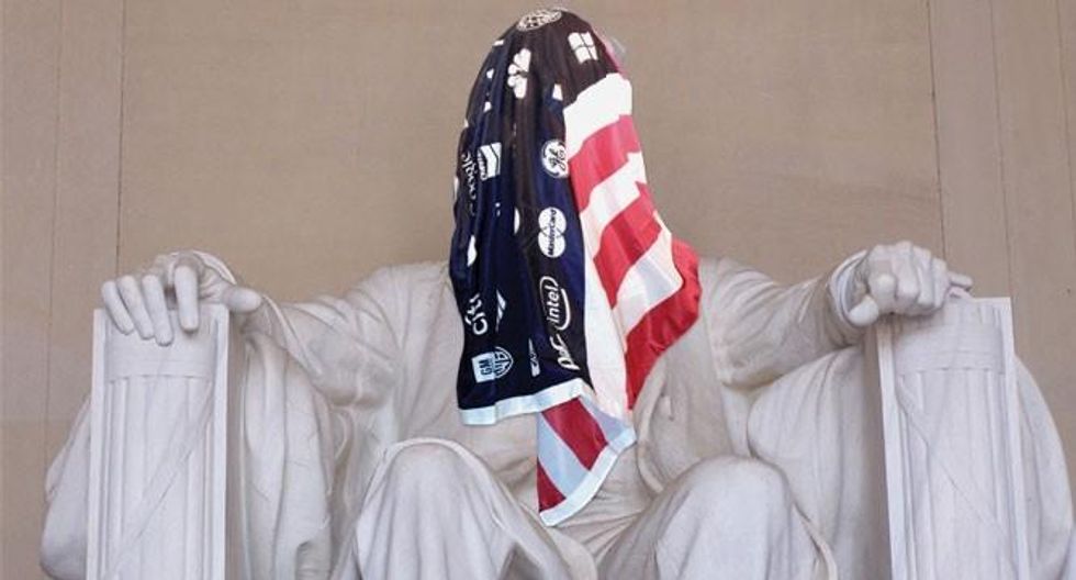 That's the America of today, and it's a glimpse of the very near-term future. The formula is pretty simple, really. Wealthy elites who have spent the better part of a century chafing under the unbearable burdens of the New Deal and Great Society (where they are rendered mere billionaires instead of zillionaires) have finally found a way to steal back 'their' money. Buy whole political parties, buy the media, buy - therefore - the entire mindset of the country, buy the Supreme Court, dumb down education, especially the study of history, make college prohibitively expensive, repress dissent, create distracting enemies abroad (towelheads) and at home (fags), replace jobs with machines and cheap overseas workers, squeeze the economy so that money is scarce, and divide and conquer the 99 percent, so that those who miraculously still maintain a vestige of decent wages and benefits from an ancient civilization called 20th century America will be resented and torn-down by those already drowning.