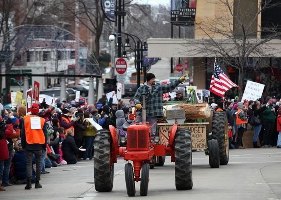 In support of the occupiers, the daily protests outside the capitol grew into crowds of 10,000, 25,000, then upward of 100,000. People marched in the snowy streets to challenge Walker, Wisconsin Republicans, and their political donors. Tractors circled the capitol in protest, as did firefighters and cops, even though their bargaining rights had been exempted from Walker's "reform" proposals. By now, Madison had captured the nation's attention.