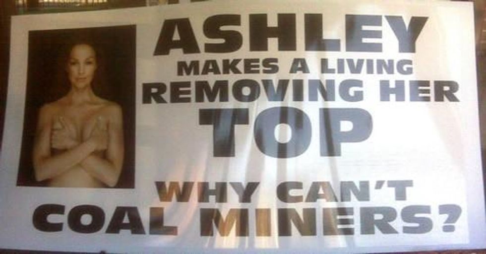 In 2010, mountaintop removal supporters in Kentucky erected a giant poster disparaging the actress Ashley Judd, an Appalachia native and activist, following a speech critical of the practice. The sign featured a photo of a semi-nude Ms. Judd and read: "Ashley makes a living removing her top. Why can't coal miners?"