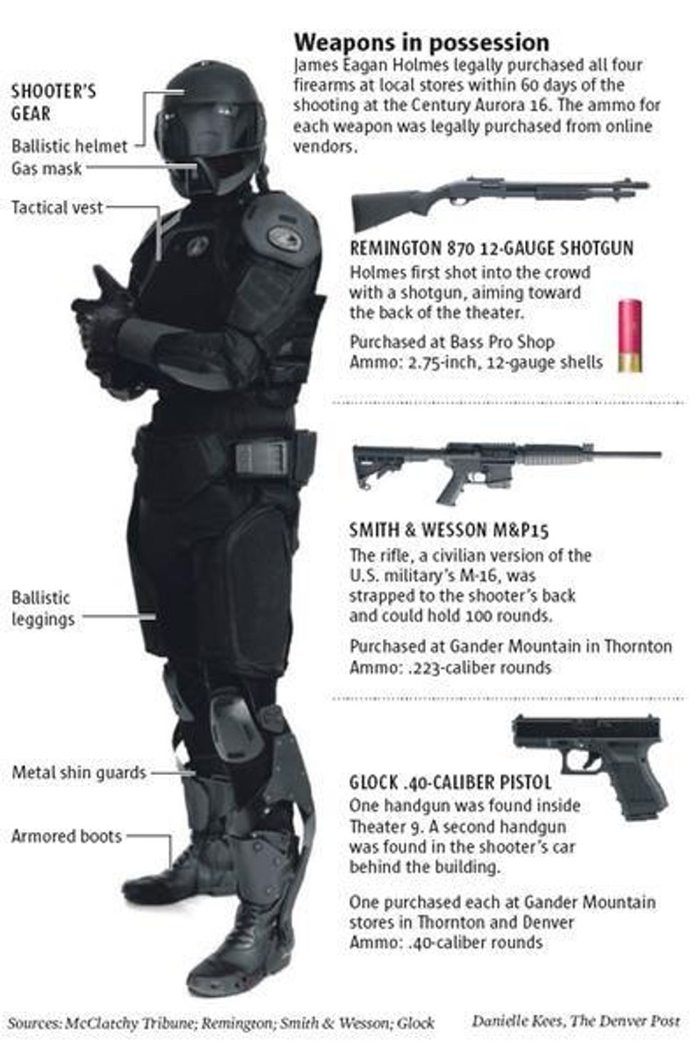 When 24-year-old James Holmes walked into the Century Aurora 16 movie theater last week, he was prepared for war. For starters, he was armored. He wore a ballistic helmet, a gas mask, body armor, metal shin guards, ballistic leggings and armored boots. He was also armed to the teeth. He had two semiautomatic Glock .40-caliber handguns, a Remington 870 Express Tactical pump action 12-gauge shotgun and a semiautomatic Smith & Wesson M&P 15 rifle. The M&P is an AR-15 style rifle, the civilian version of the military's M-16.