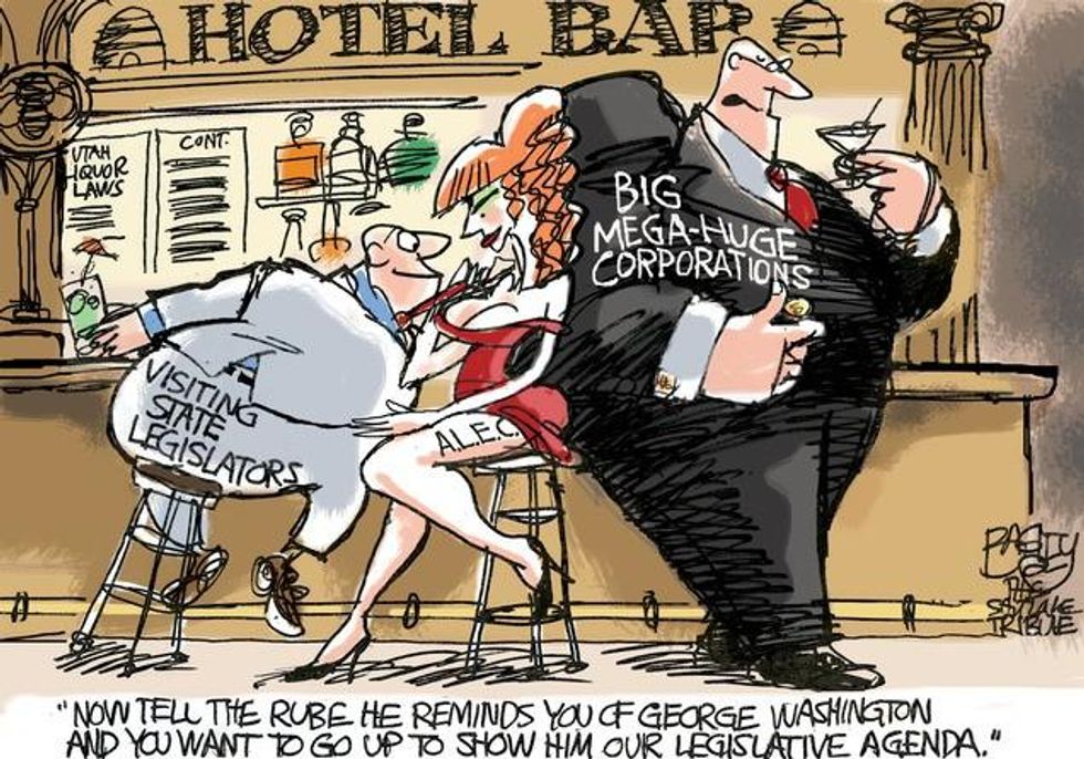 But in this instance, ALEC was a hot redhead flirting with out-of-state legislators while a lobbyist for "Big Mega-Huge Corporations" tells ALEC, "Now tell the rube he reminds you of George Washington and you want to go up to show him our legislative agenda."