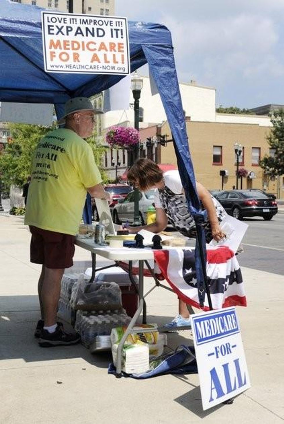 Medicare turned 47 years old last Monday. Bill Mahan celebrated by setting up a booth on Main Street to try to convince passersby that America's health insurance crisis could be eased considerably if everyone had Medicare.