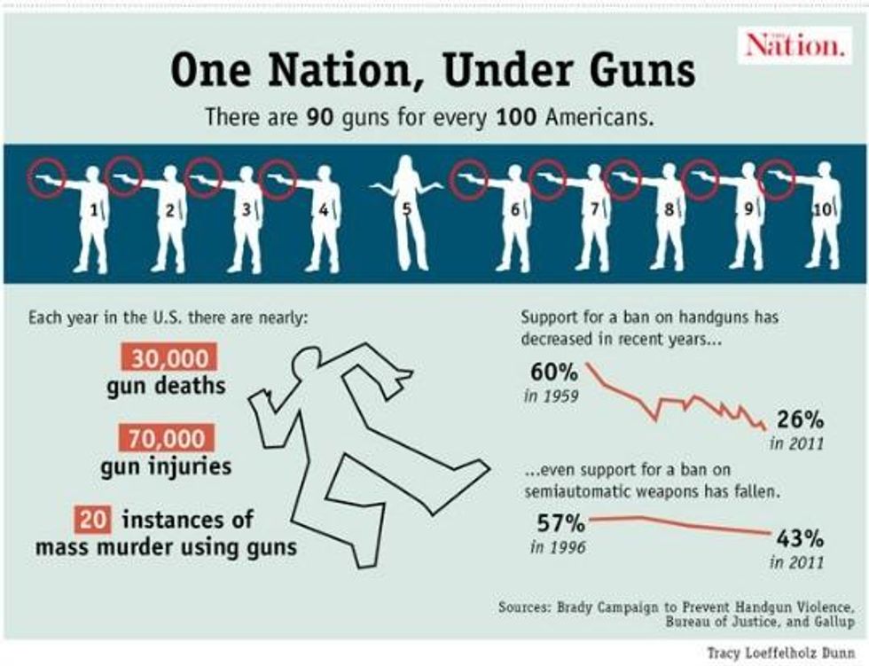 In the absence of leadership at the national level, big-city police chiefs and mayors like Michael Bloomberg have tried to step into the breach. But with little support from the top and lacking an impassioned mass movement, to say nothing of money to combat the NRA's huge war chest, it's no wonder that gun control has shriveled into a Worthy Cause. According to Gallup, in 2011 only 26 percent of Americans favored a ban on handguns, down from a high of 60 percent way back in the dark ages of 1959. (Other polls show the country evenly divided but still unchanged by the recent mass murders.) Membership in the NRA has been increasing for decades and now stands at 4.3 million. As for the 30,000 annual gun deaths, 70,000 injuries and almost twenty mass murders a year? The ninety guns for every 100 Americans? It's something to wring your hands about, like sexting or obesity or plastic bags. Just another weird American thing.