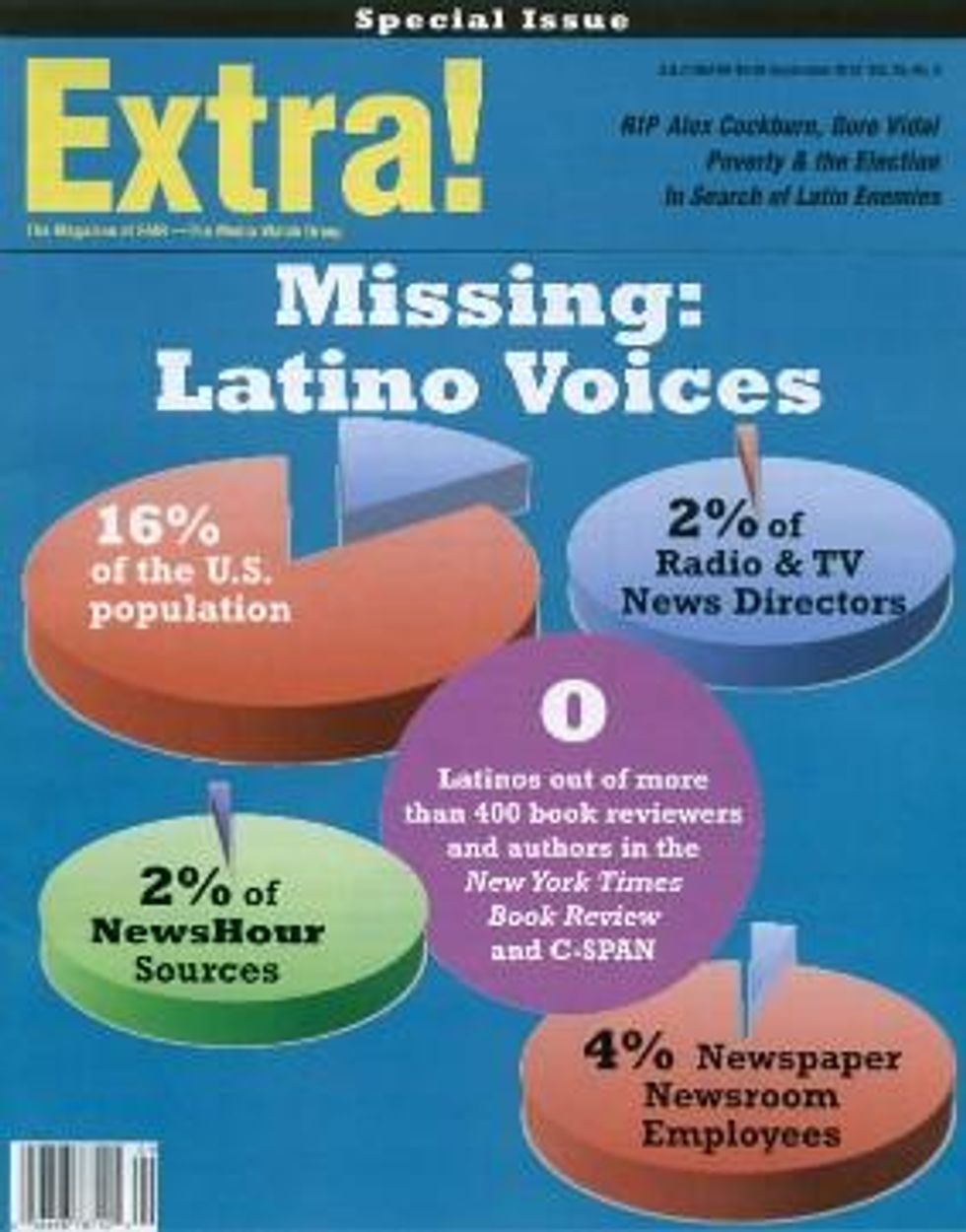 As companies like Fox and NBC begin to target Latino audiences with special channels and websites (see "Latinos in New Media," Extra!, 9/12), will those audiences feel better served, or just ghettoized and exploited? And will that provide just one more excuse for those outlets to continue to marginalize Latino sources and reporters in their other news? Whatever decisions big media make, Latino journalists like those featured in this issue will continue their struggle to make a place for themselves and their growing communities in the country's media landscape.