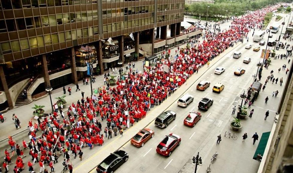 The Chicago teachers who picketed at the Hyatt chanted, "Give it back!" With corporate handouts continuing as schools and other public programs suffer around the country, that's a demand we may start to hear much more often.